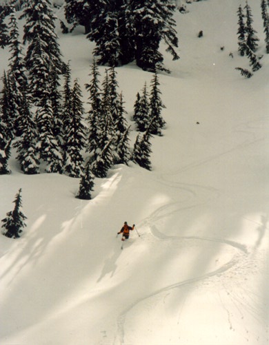 Laure snaking down the flanks of Snow Lake - Alpental Back Country - Winter 1998