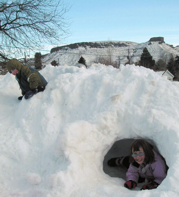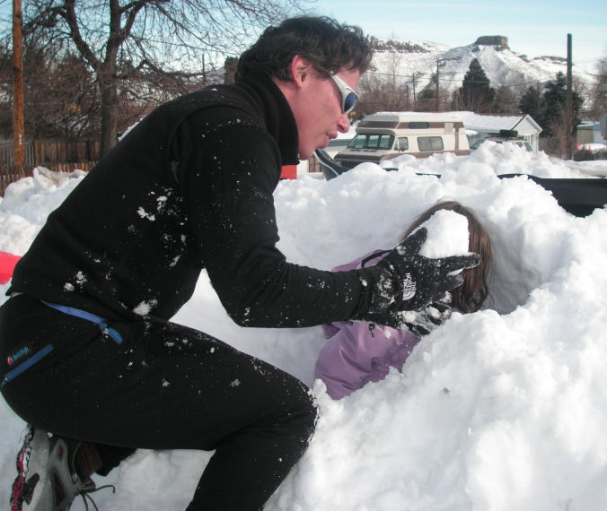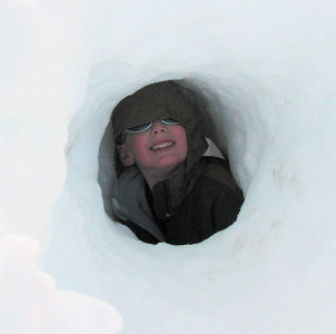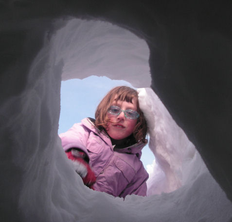 Finished snow cave - complete with main entrance (Elena) and escape route (Tyler)